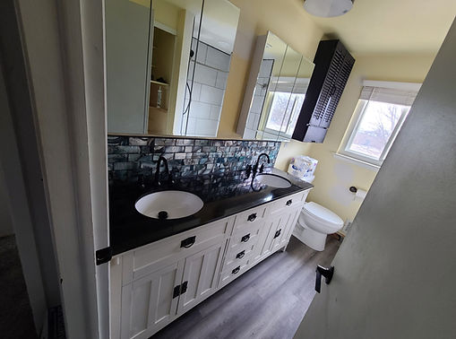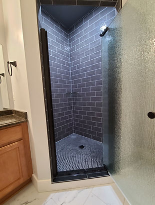 This client chose to go with a gloss black tile, black fixtures, and marble look luxury vinyl plank flooring. They decided to keep their original vanity and mirror.